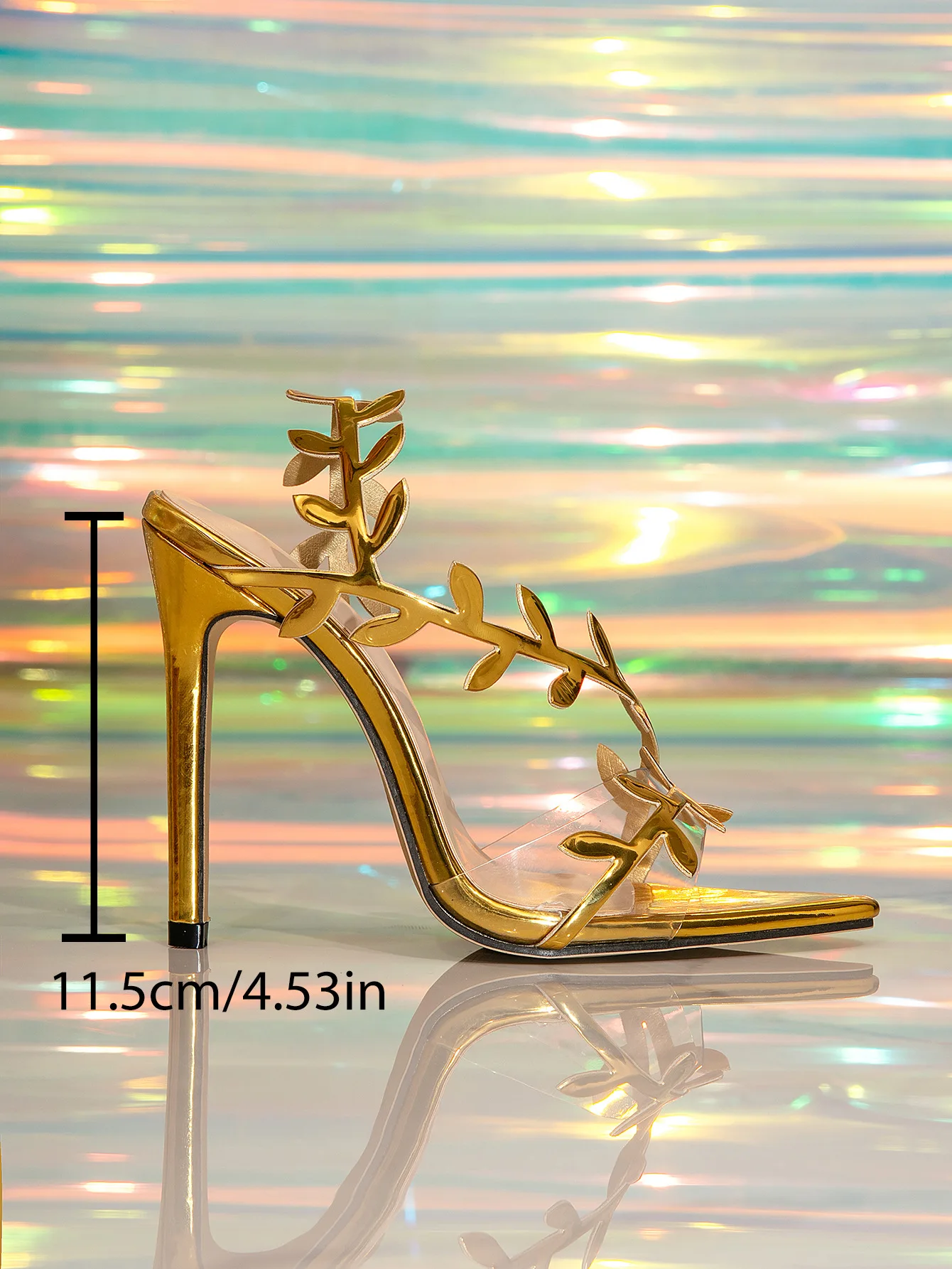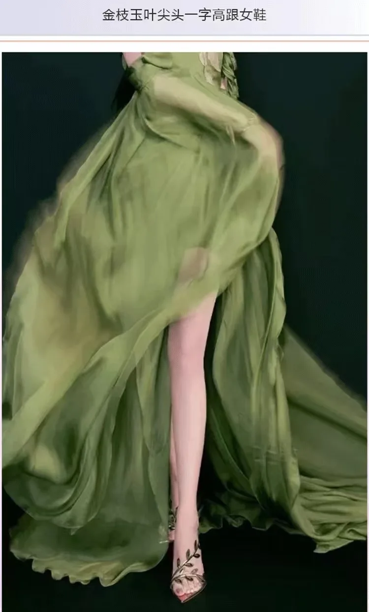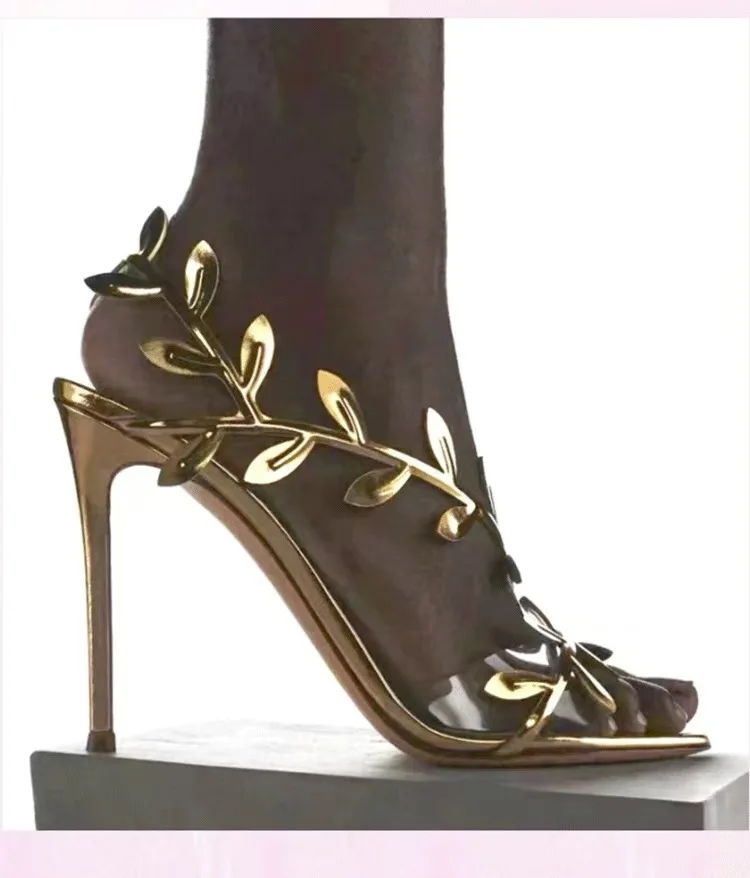 2025 New Style Women Sandals Foreign Trade 11.5cm Stiletto Lady Shoes Fashion Pointed Toe Leaf Decoration Gold Losed Toe Sandals