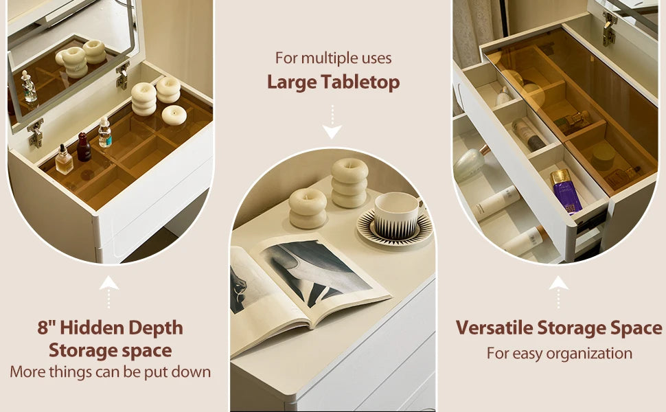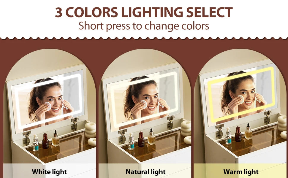 🪑 Matching Makeup Stool PU-padded stool with ergonomic height offers comfy seating. Tucks neatly under the desk to save space.