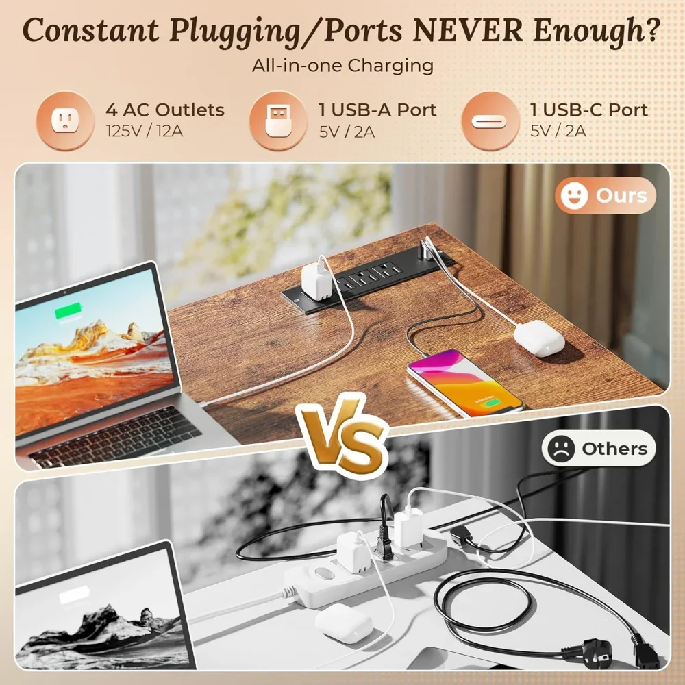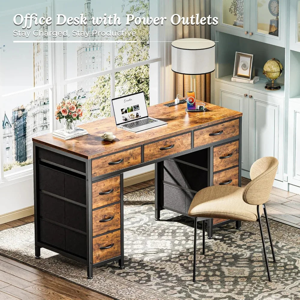 47 Inch Office Desk with Outlets, Computer Desk with 9 Fabric Drawers, Writing Gaming Work Study Desk for Bedroom,