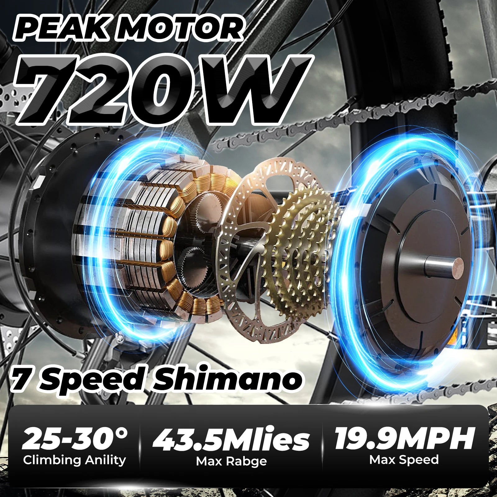 Adult electric bicycle, 26 inch electric mountain bike with detachable battery, 720W peak 36V motor, 7-speed 20MPH Ebike