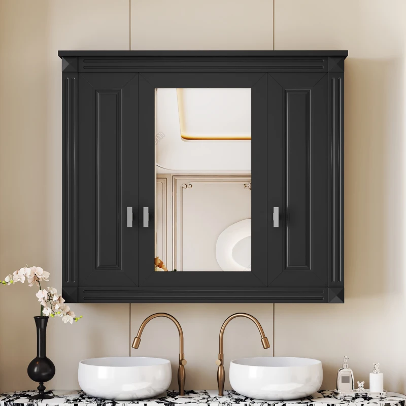 This wall-mounted mirror cabinet combines high-quality MDF panels and high-definition mirrors to create a sturdy and beautiful home storage solution. The exquisite mirror provides clear reflections, making your daily grooming more convenient. The unique design combines hidden storage and open shelves to meet different storage needs. Three large storage cabinets can easily hide personal items and keep the space neat and organized; three layers of adjustable shelves provide flexible storage space for various items to adapt to your changing needs. Whether in the bathroom, bedroom or living room, this mirror cabinet can be perfectly integrated, adding fashion and practicality to your home.