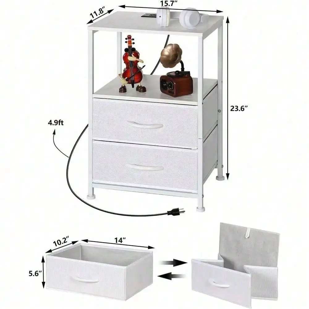 Bedroom Nightstand Set of 2 White End Table w/ Fabric Drawers & Charging Station