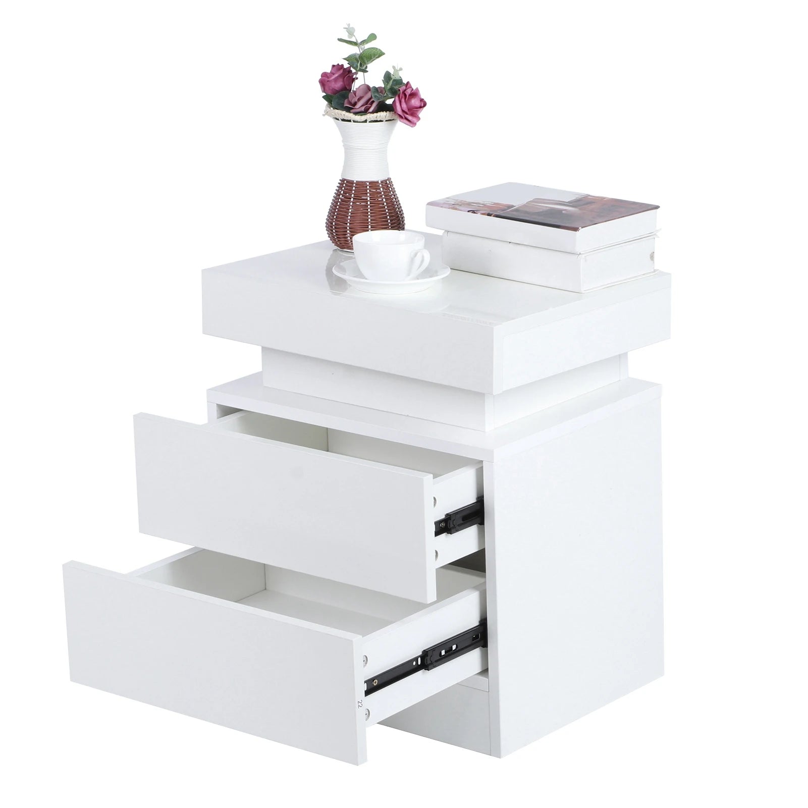 1. This bedside table is made of melamine chipboard material, and the drawer fronts with high gloss finish. The bedside unit can serve the weight capacity as high as 40kg.2. This bedside table is finished by high gloss front, equipped with decorative satined glass elements around, with the LED backlit come throught to creat the warm bedtime for your bedroom.
