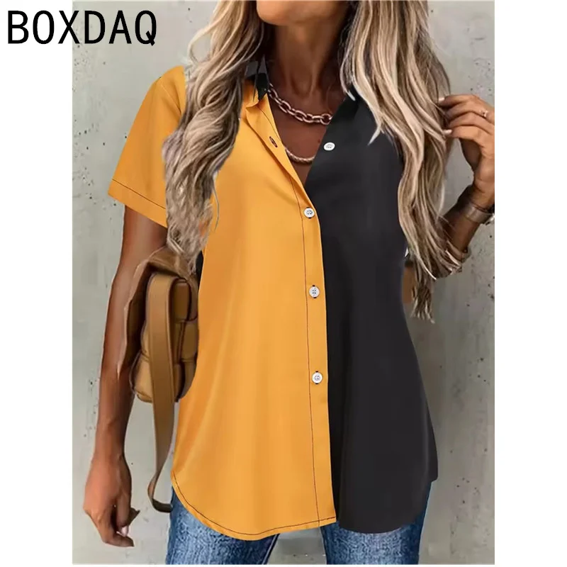 Classic Fashion Two Color Spliced Short-sleeved Shirt Women's Summer New Casual Buckle Slim Shirt Office Ladies's Work Shirt