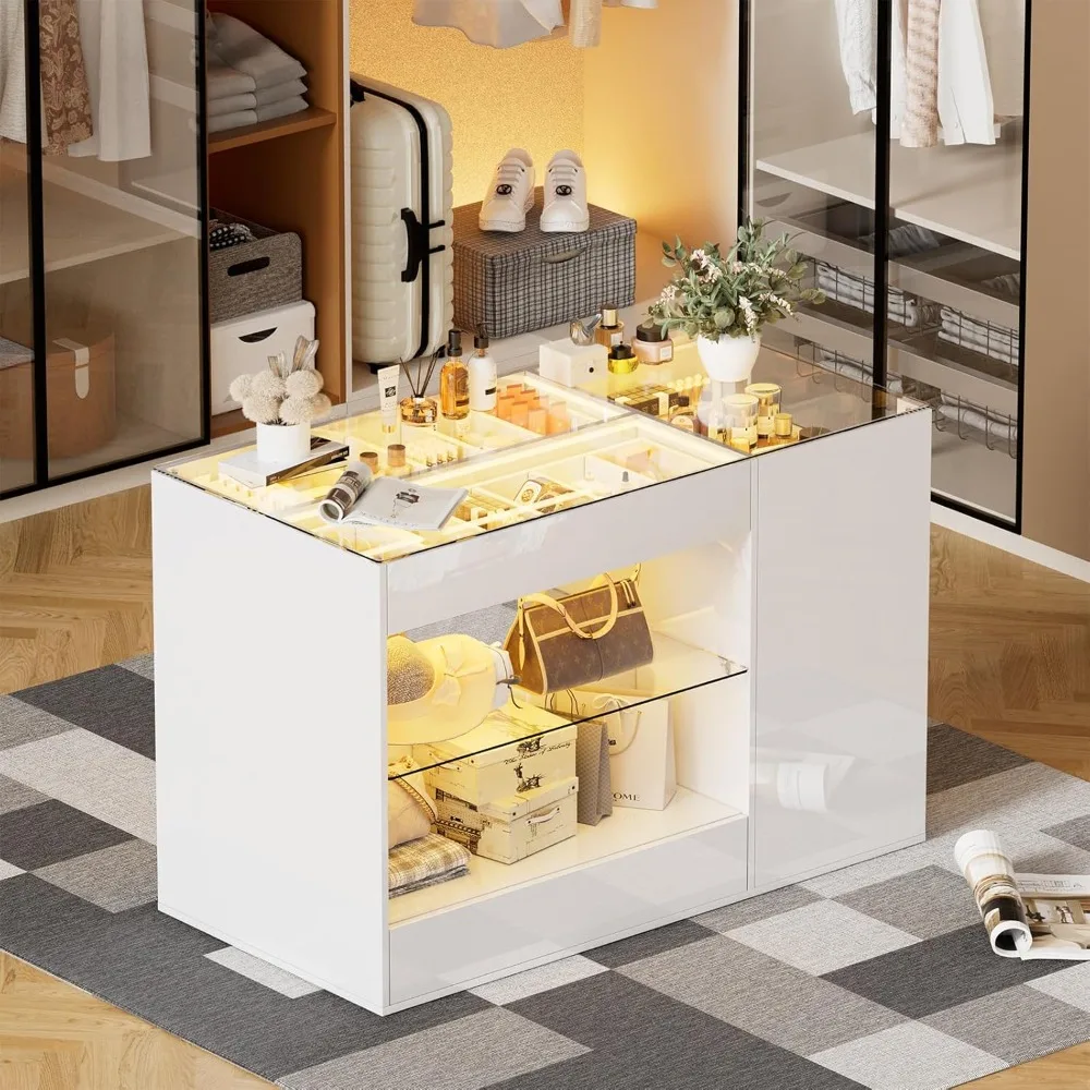 Closet Island with Drawers, Glossy Wardrobe Armoire Bedroom Island, Makeup Vanity Storage Island with Glass Tabletop&LED Light,