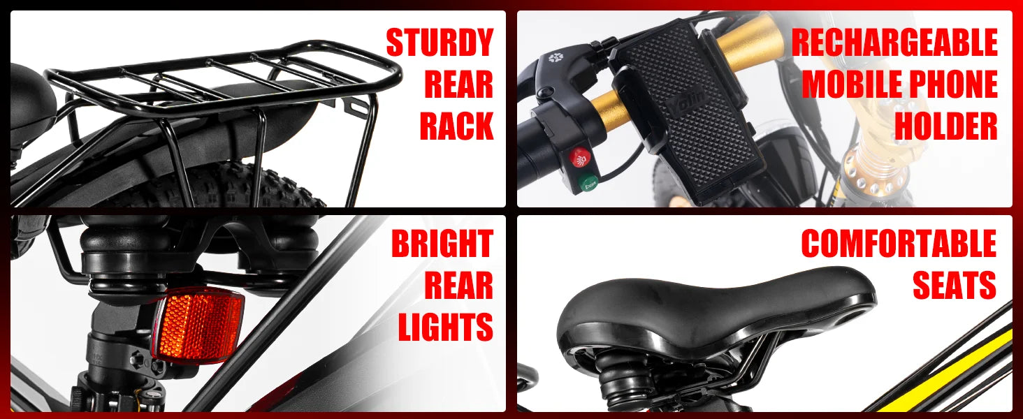Front and rear mechanical disc brakes provide powerful and stable braking force, ensuring safety during high-speed riding. The front suspension system combined with 4.0-inch ultra-wide fat tires effectively absorbs road vibrations, offering exceptional traction and stability, even on uneven terrain and gravel. High-brightness front lights and a horn ensure safety during nighttime riding, keeping you visible and alerting others promptly.