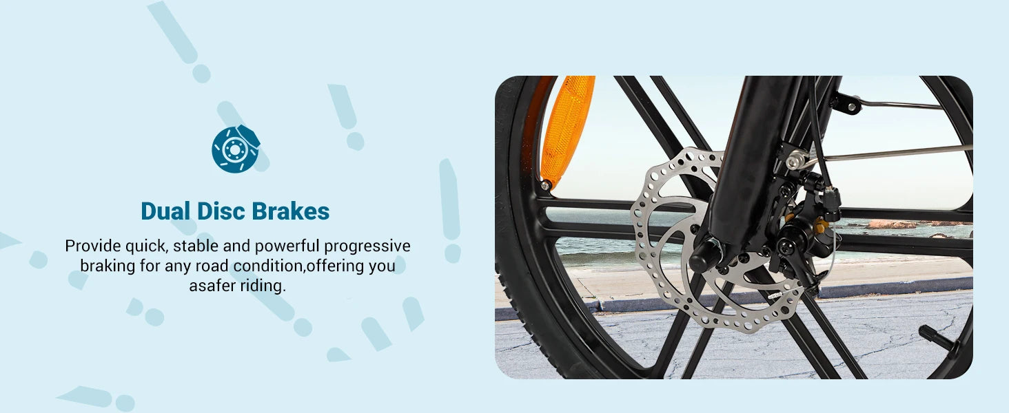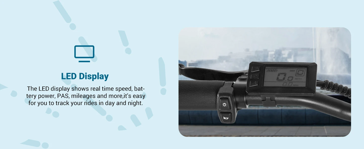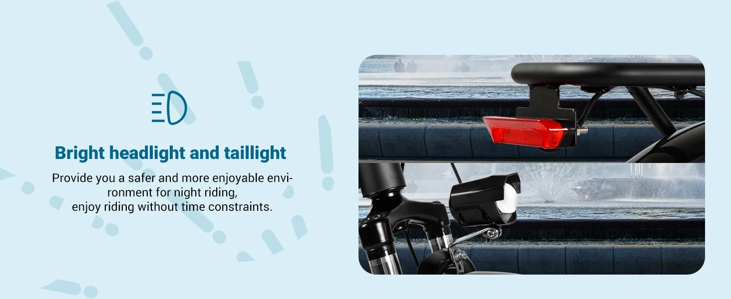 Front and rear 160mm disc brakes provide instant braking even in rainy or snowy conditions; a high-performance suspension fork and 20-inch anti-slip tires absorb bumps on rough terrain; LED headlights and taillights ensure 360-degree visibility during nighttime rides.