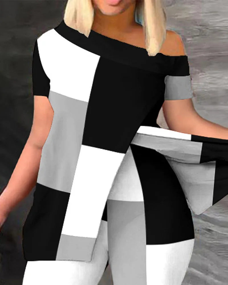 Elegant Women Two Piece Set Suits New Fashion Printed Ruffle Sleeve Top Solid Color Pants Set With Belt Blouses Female Clothing