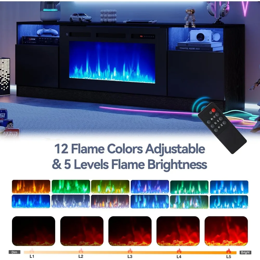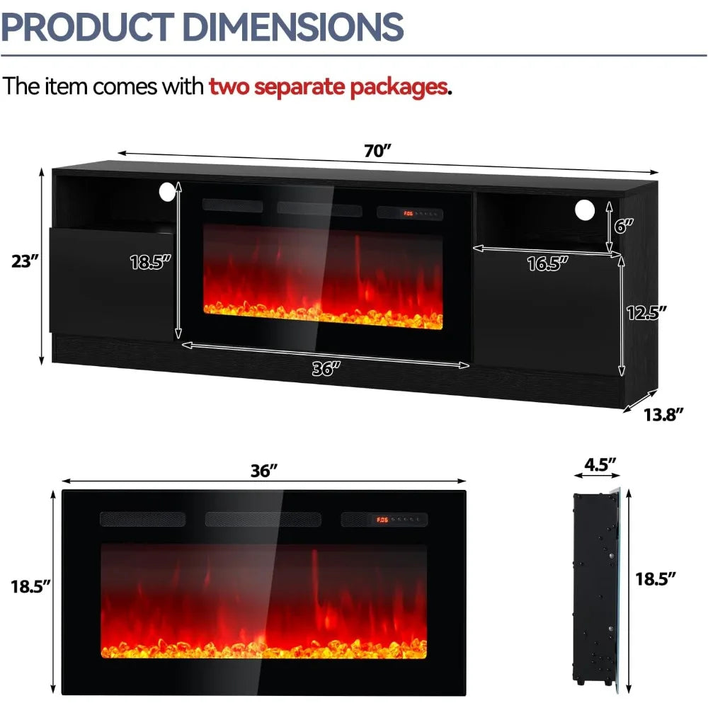 - 2-In-1 Set: This fireplace TV stand combines a 70-inch TV cabinet with a 36-inch electric fireplace, making it a versatile home entertainment center. The dimensions of this electric fireplace TV stand are 70" L × 13.8" W × 23" H, accommodating TVs up to 80 inches. The living room TV stand includes three flame modes to meet various needs.