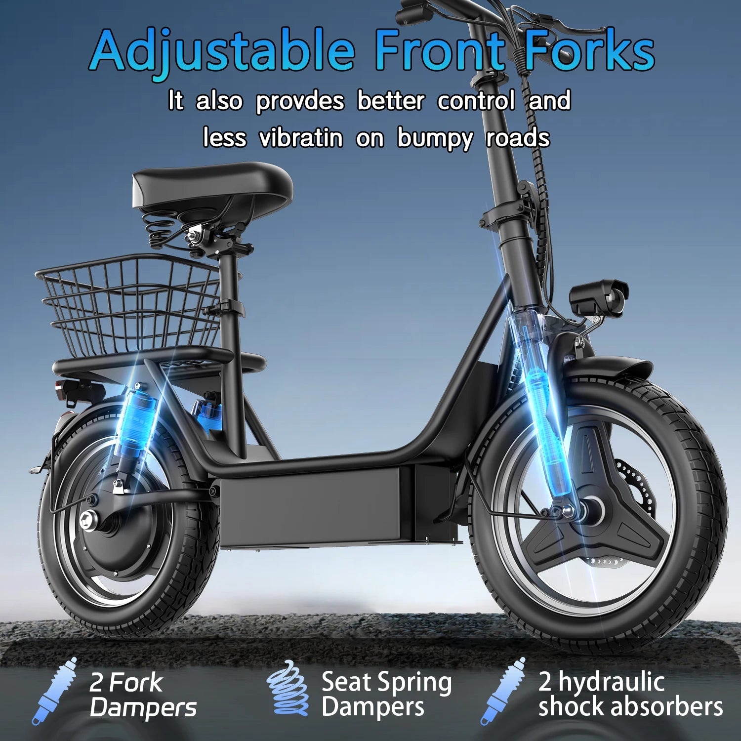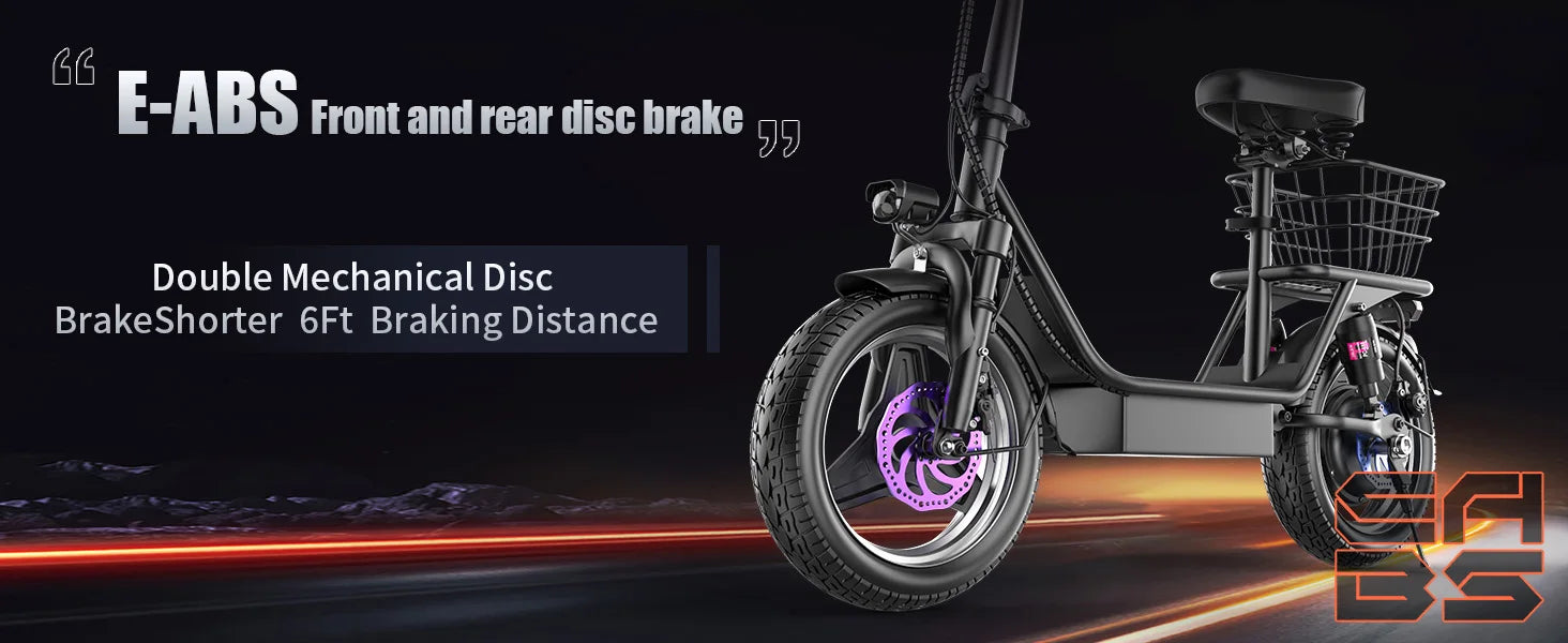 [Full Suspension and 14" Fat Tires] The e scooter comes with full shock absorptions (front, rear suspension, and seat shock) that significantly reduce shock, making your ride more comfortable and stable. The 14" large pneumatic tires have excellent grip, high elasticity, and wear resistance,suitable for multiple road conditions