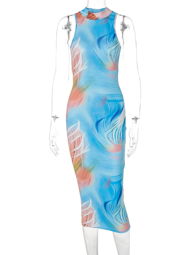 Hugcitar Tie Dye O Neck Sleeveless Backless Sexy Bodycon Slit Midi Dress 2023 Summer Women Fashion Clothes Y2K Streetwear Party