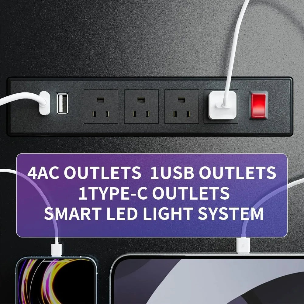 - 【Smart LED Light System And Charging Port】: U shaped desk is equipped with 4 AC , 1 type-C and 1 USB charging port. The U shaped desk is equipped with RGB LED light system, which can be controlled remotely by via APP. It has multiple colors and flashing modes for you to choose. LED light system with music synchronization function, built in sensitivity adjustable microphone. So LED light color will change with the rhythm of sound and music. It also has a timer function to bring you a smart life.