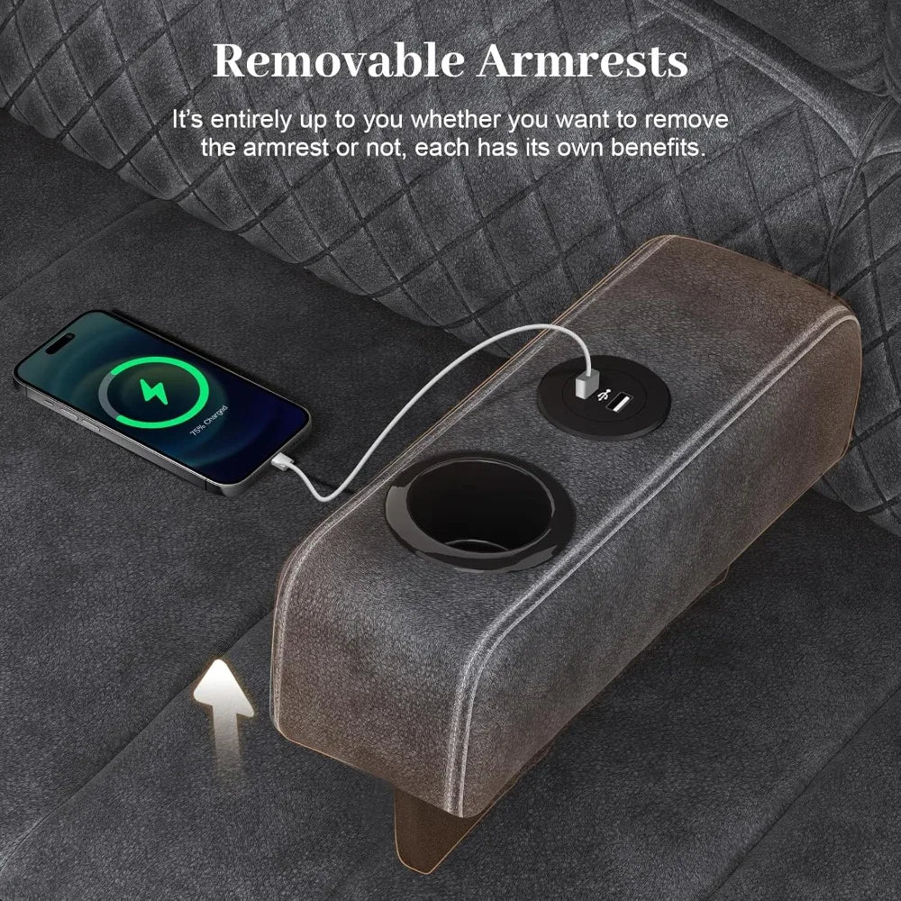 - Removable Armrest: In order to meet the customized needs of more users, the middle armrest of our recliner love seat can be easily disassembled. Installing the armrest can provide you with additional cup holders and 2 USB charging ports, making the entire sofa more functional. Of course, dismantling it also has its benefits, as the space is more spacious and you are closer to your loved one without being hindered.