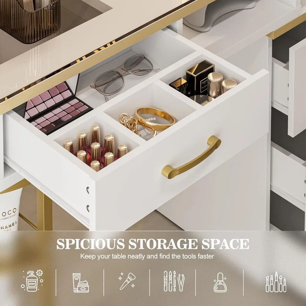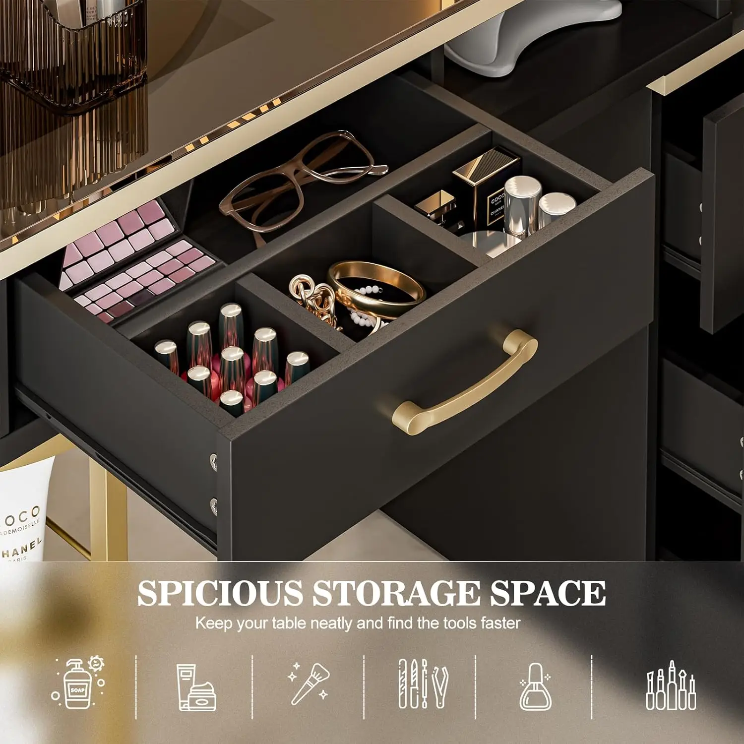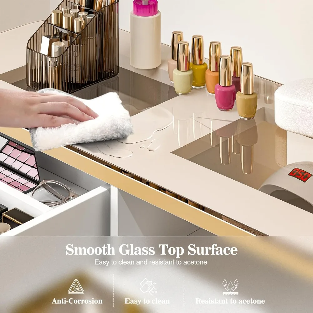 - 【EASY TO CLEAN & VISIBLE】The tabletop is covered with a single piece of thick glass which is not only waterproof but also easy to clean. The glass in the middle of the tabletop provides a window into the display drawer, which can be used to display nail polish or store frequently used nail tools, making your space more neat and organized