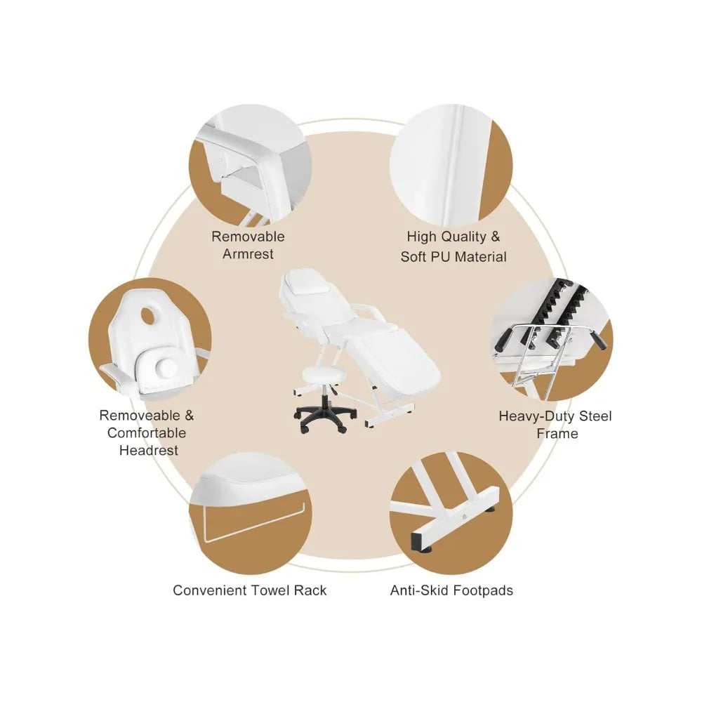 3-section reclining design with armrests perfect for massages, tattoos, waxing, threading, and salon services