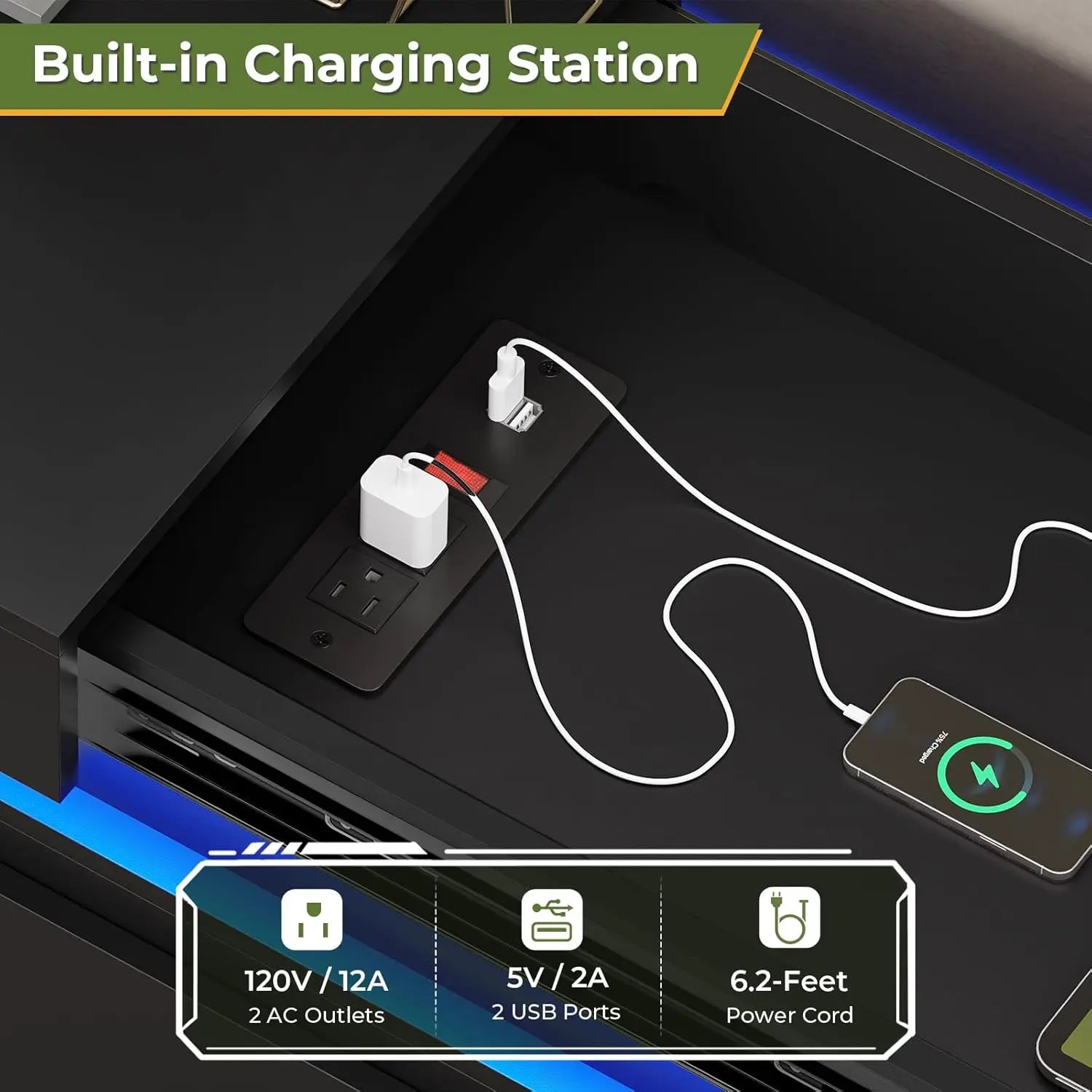 Modern 6 Drawer Dresser with Sliding Desktop, Wide Chest of Drawers with Charging Station & LED Lights, Large Storage Tower Clothes Organizer, Black Dresser for Bedroom