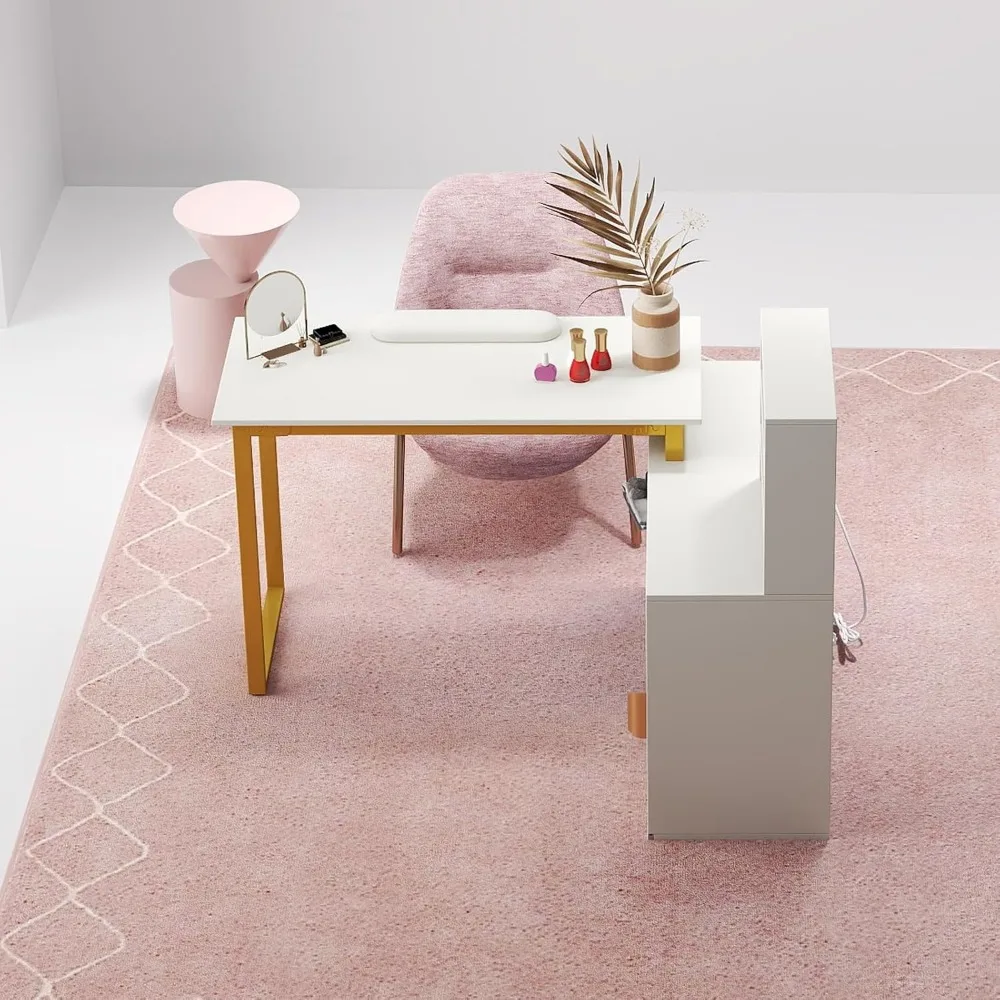 - PERSONALIZED DESIGN - The whole storage shelf above it can be installed on one side of the desktop. With 1.5M long power cord, two 3-prong AC outlet and 2 USB ports, this manicure table offers you enough charging space for your electronic devices
