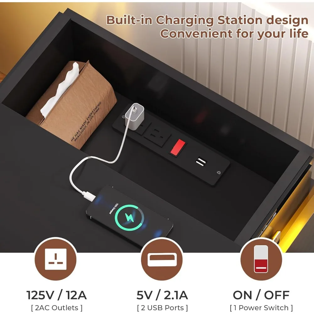 Nightstand with Charging Station and LED Lights, Led Nightstand with Sliding Top, Bedside Table with Drawers, Modern End Table S