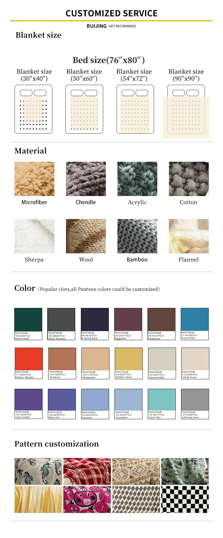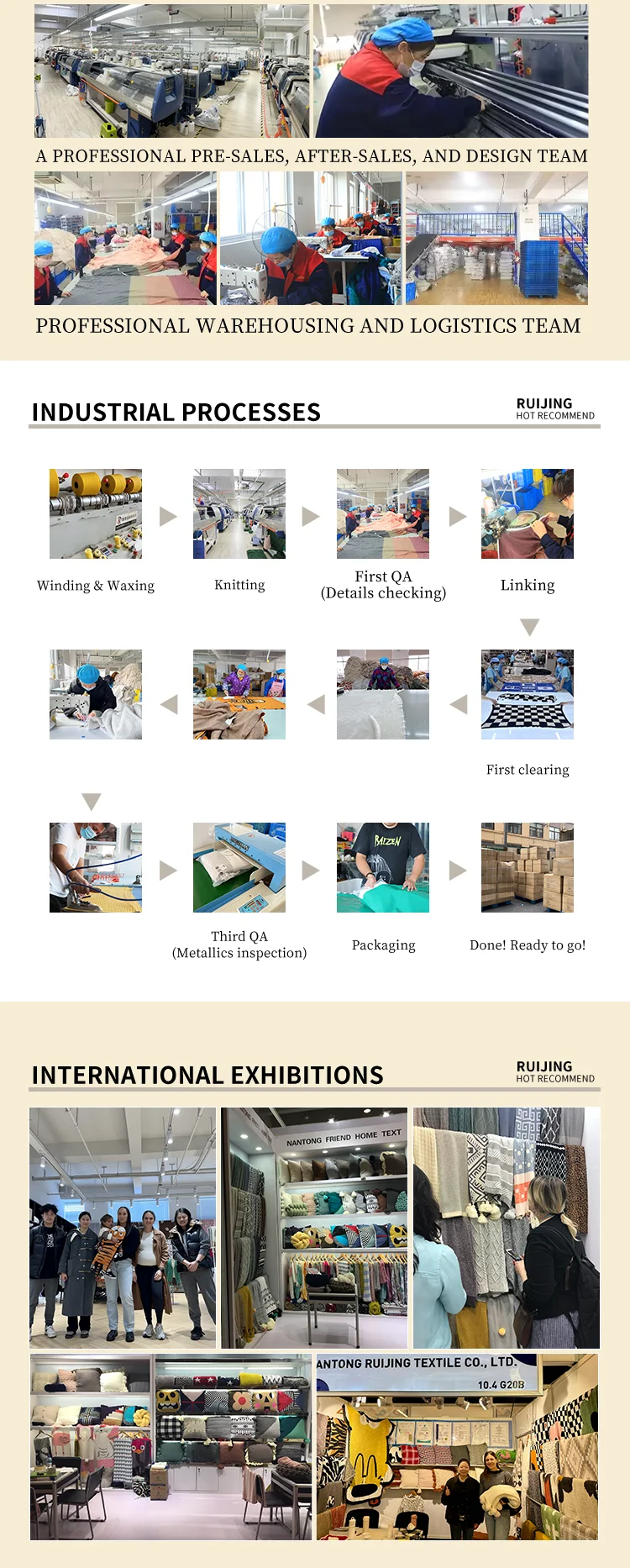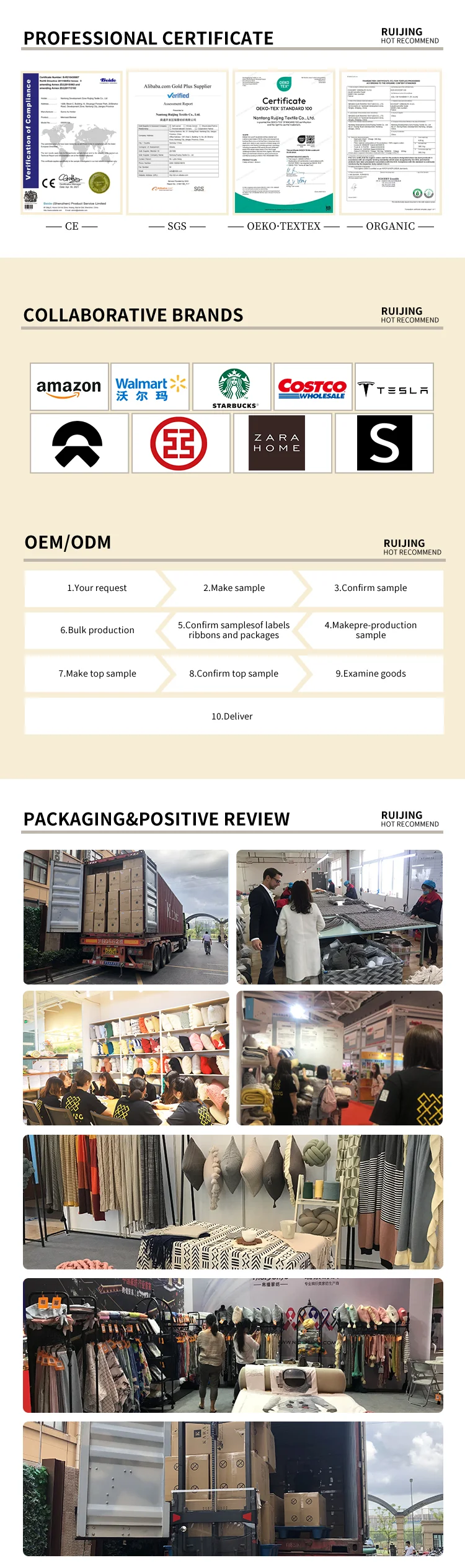 Nantong Ruijing Textile Co.,Ltd. was established in Mar. 2009.The factory building construction was completed in 2009 and production was started right after. The factory is owned by China.It is a China invested enterprise with integrated design, product development, production and sales. The annual sales is over 60 million RMB. The factory has over 6000 sqm building. Average employee number is around 100. It has a strong your team full of creativity, Themajor products include blanket, throw ,pillow and bedding textiles.
