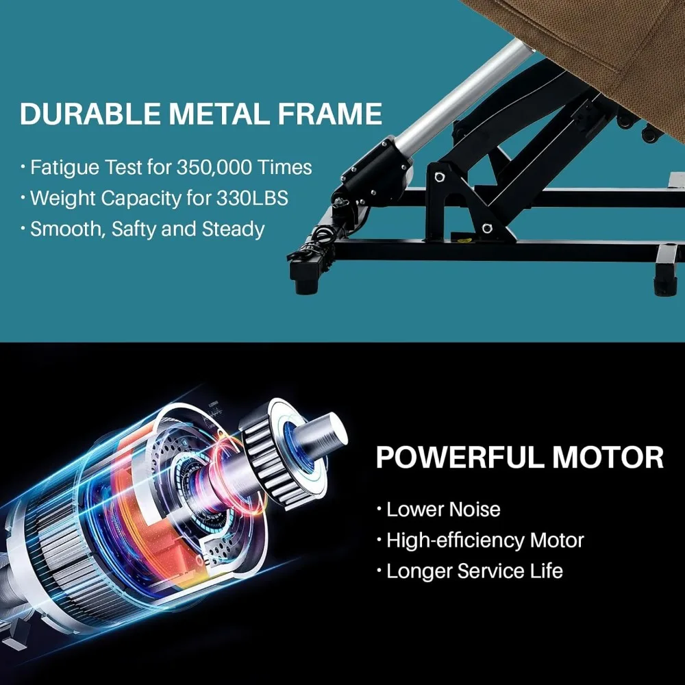 - SAFE & STURDY--The recliner's metal frame is sturdy and supports up to 330 lbs. in weight. It's powered by a German motor that runs quietly and smoothly, which in turn enables this big man recliner to lift and tilt steadily. Overstuffed sponge padding makes the seat, back, and armrests comfy. It comes with big pocket where you can slip in small items like your phone, and 2 cup holders