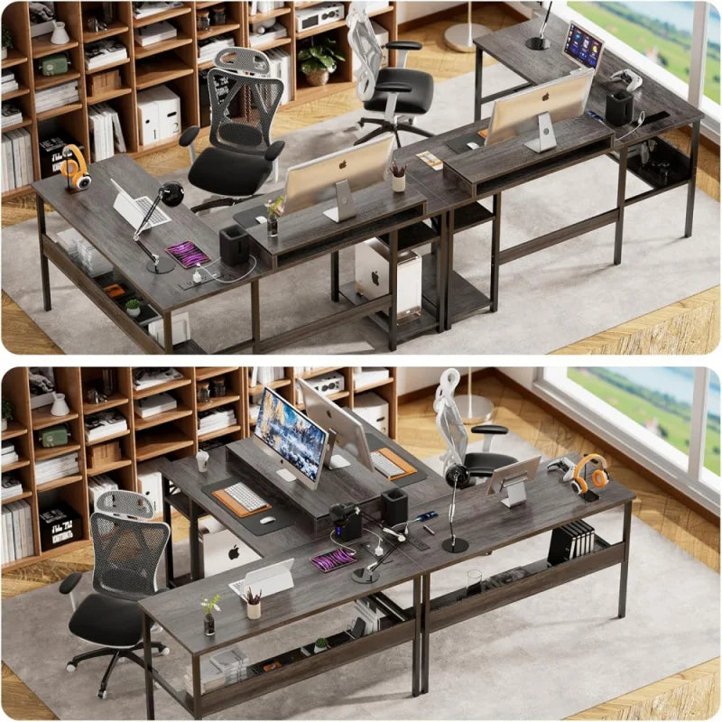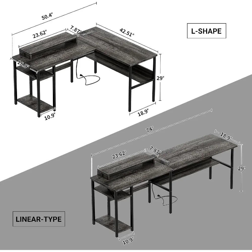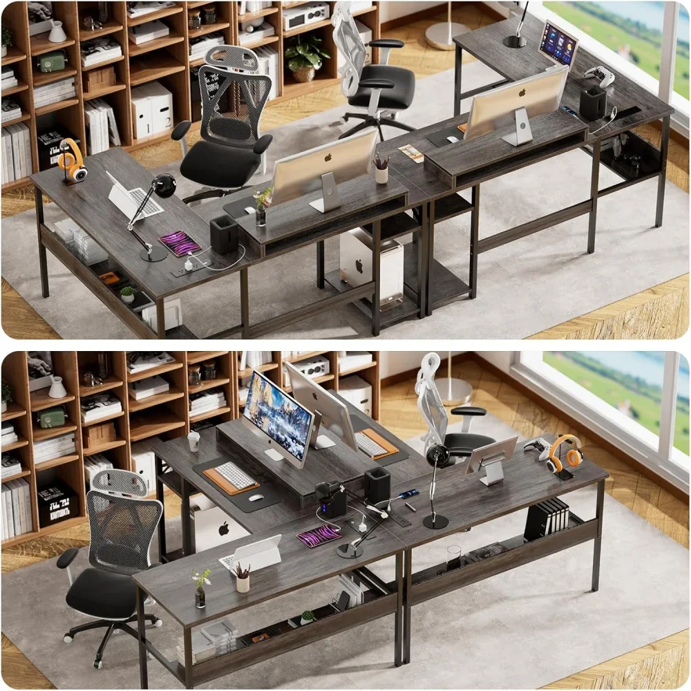 Reversible L Shaped Desk with Power Outlets and RGB LED Light, Sturdy Computer Desk with Ergonomic Monitor Stand and Storage