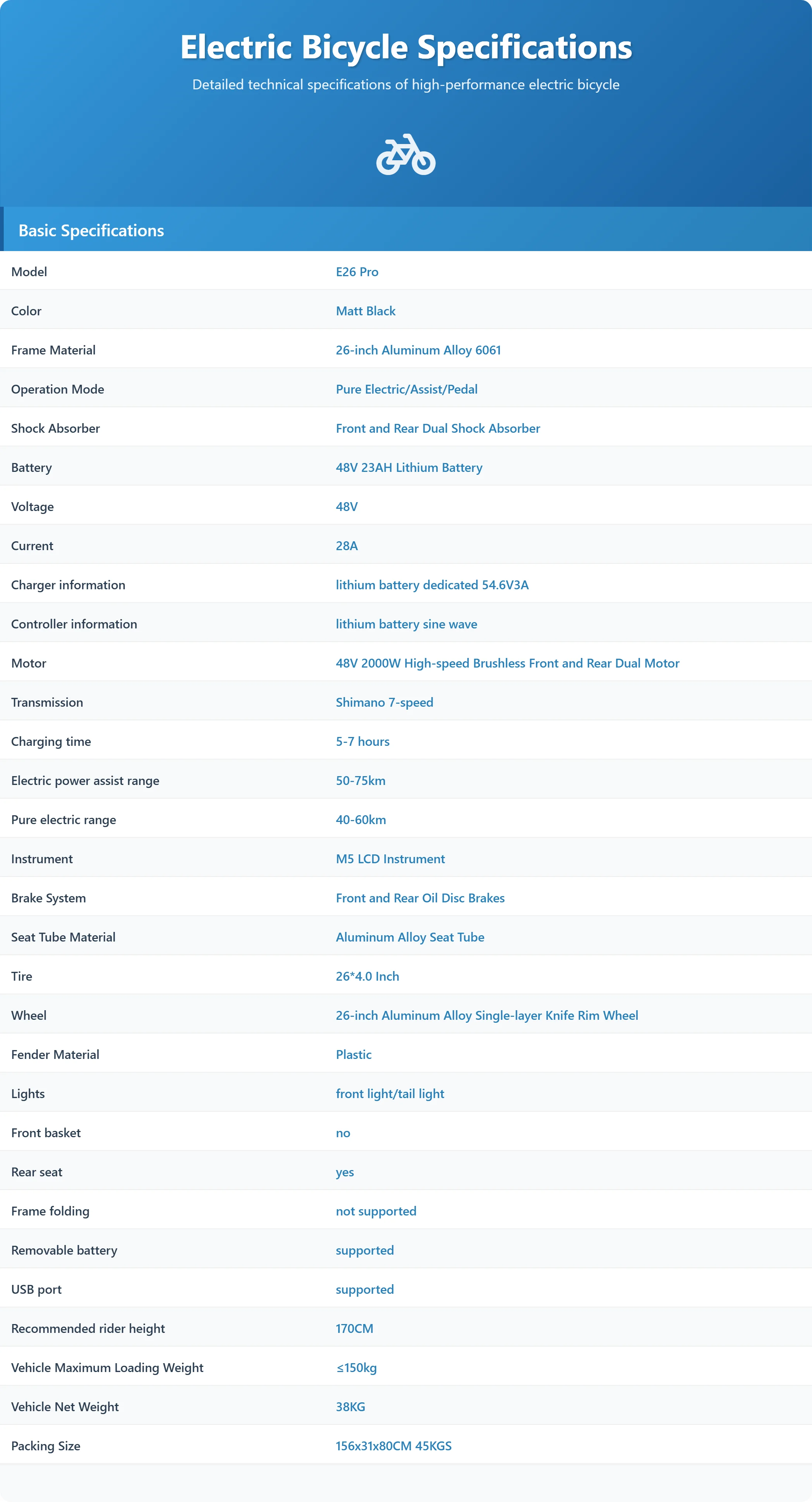 2000 W Dual Motor & 31 MPH Max Speed: Equipped with dual brushless motors providing 2000 W output, the fat tire electric bike reaches a top speed of 31 MPH. Its powerful output effortlessly conquers 45° steep hills, perfect for off-road adventures in rugged terrains.