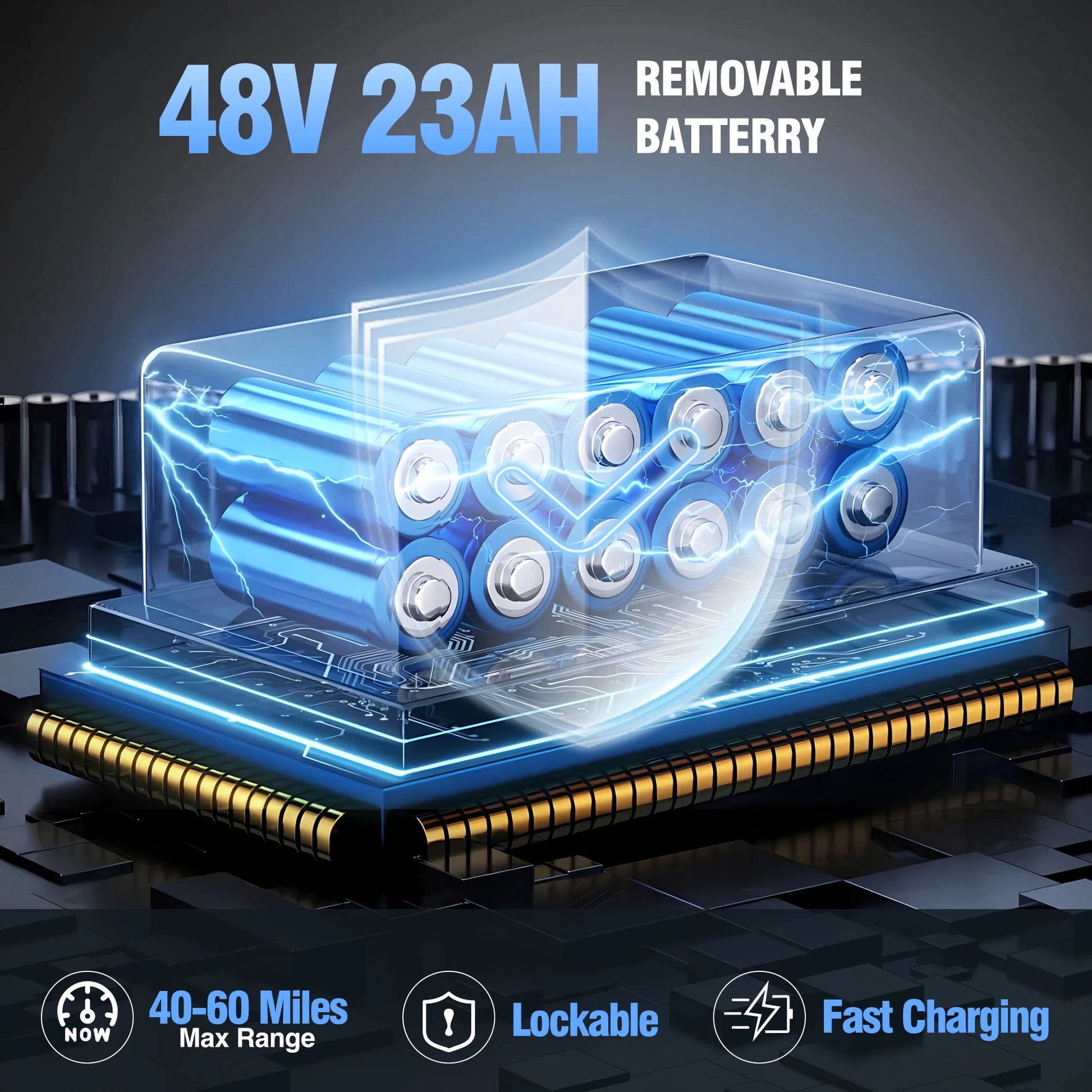 23AH Large Battery & 45 Miles Long Range: The adult eBike comes with a UL certified 48V 23Ah removable battery, offering a range of 30-50 miles.