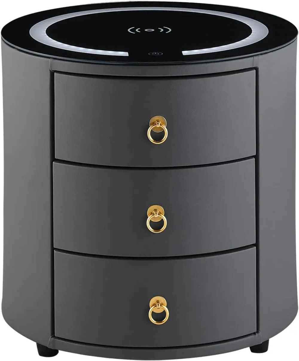 Smart Nightstand with Wireless Charging Station & LED Lights, Modern Round Bedside Table with 3 Drawers, Faux Leather End Table