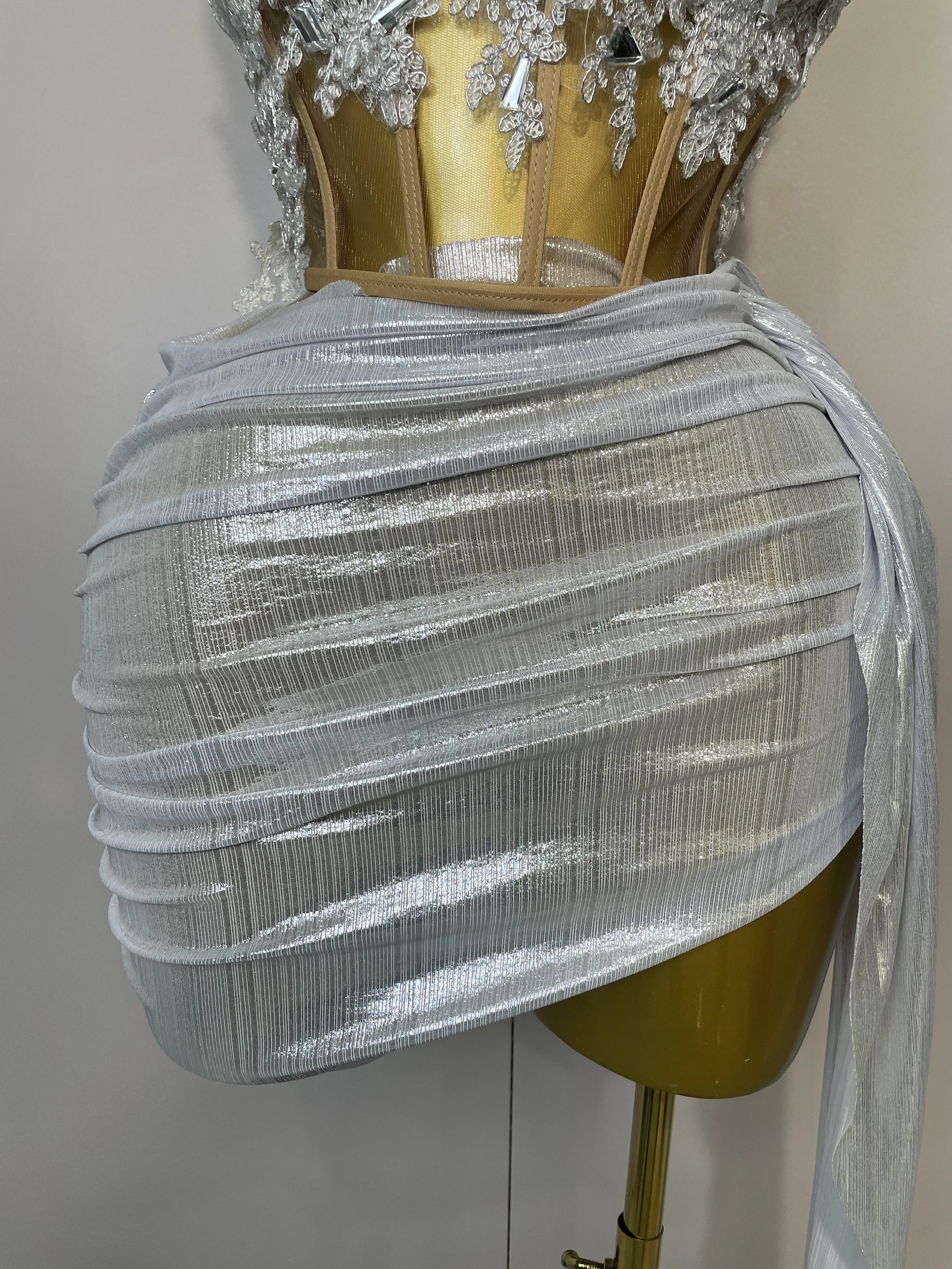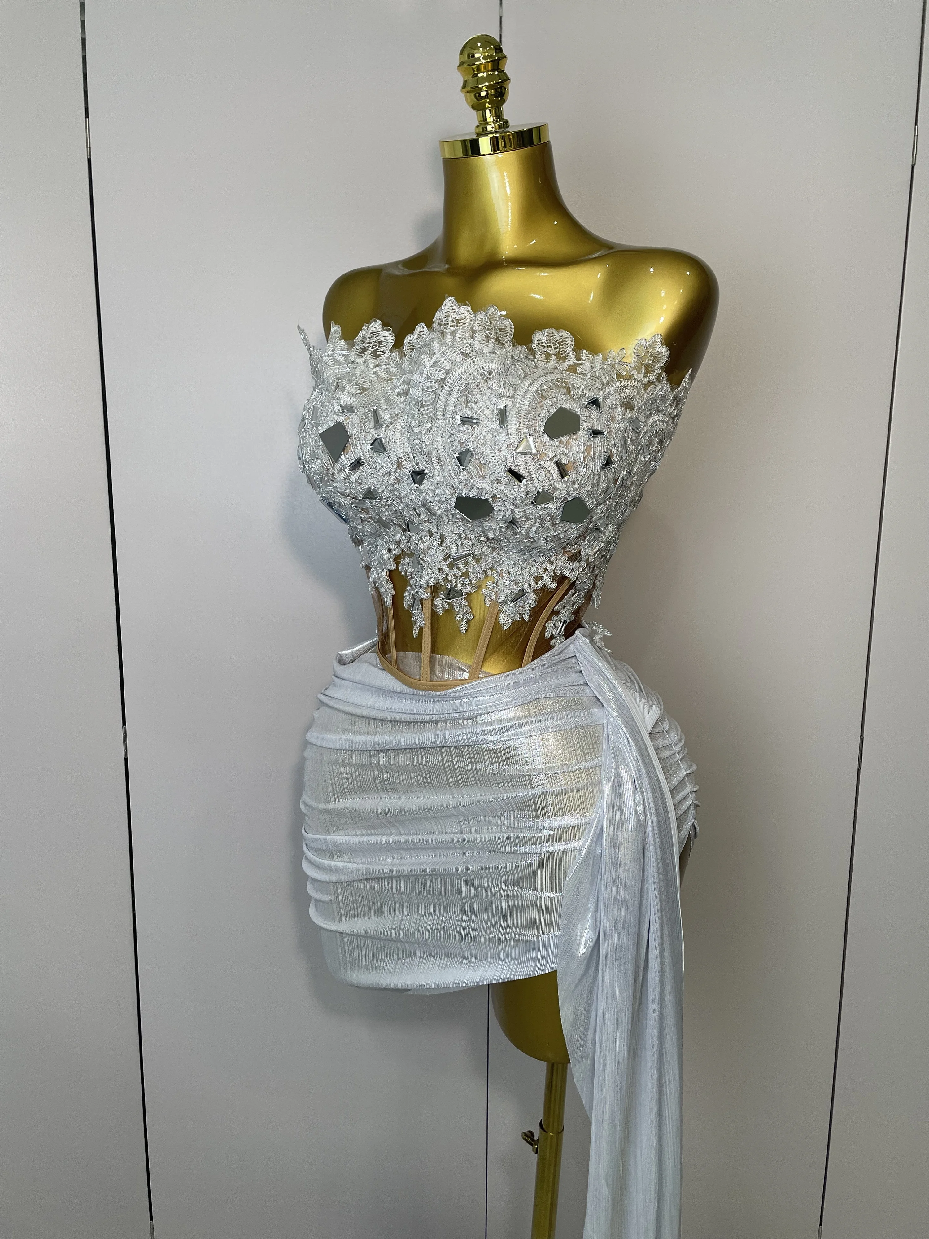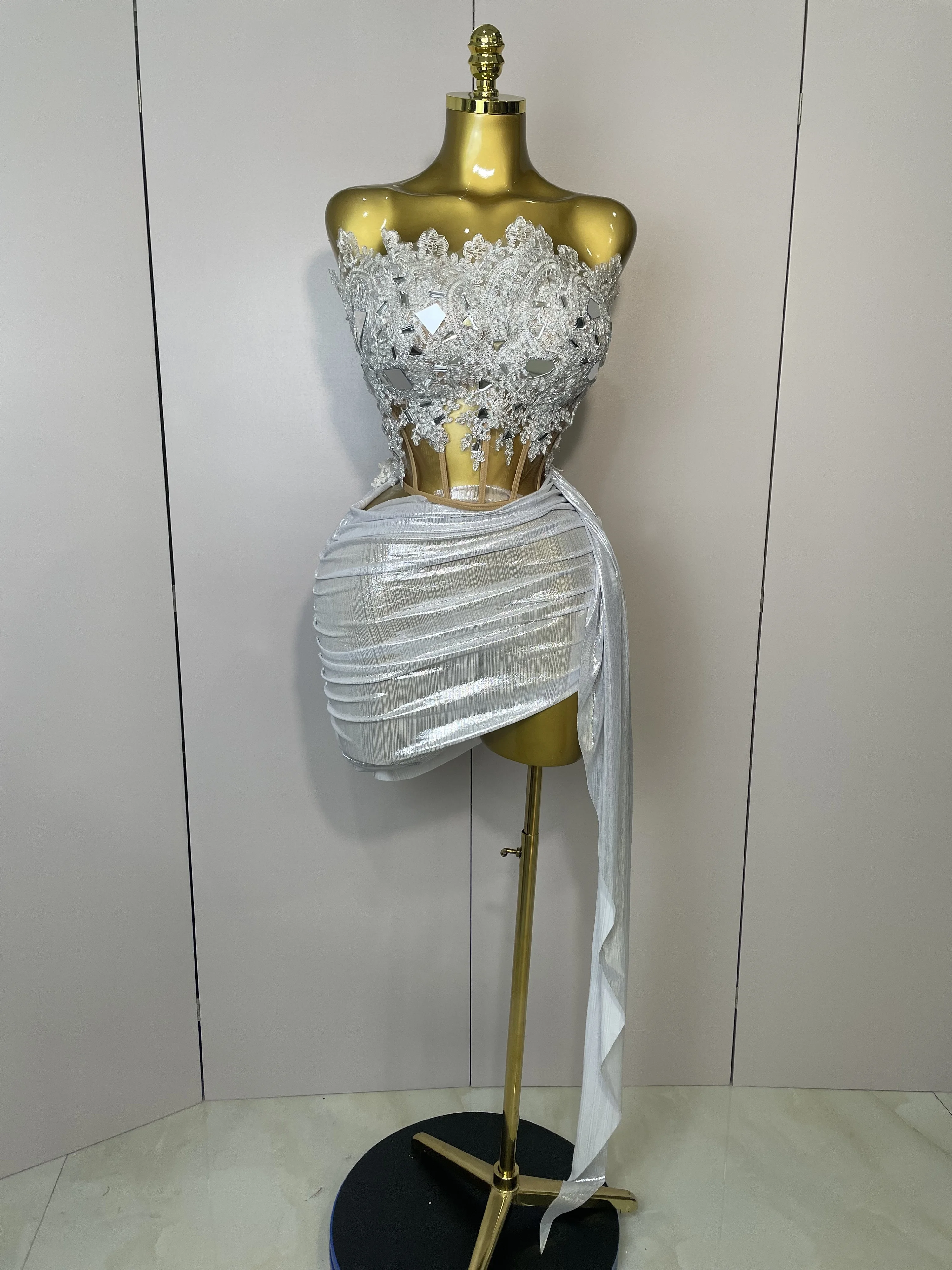 Sparkly Silver Sequins Sexy Strapless Short Dress 2Pcs Set Newest 2025 Women Party Birthday Nightclub Singer Dancer Stage Wear