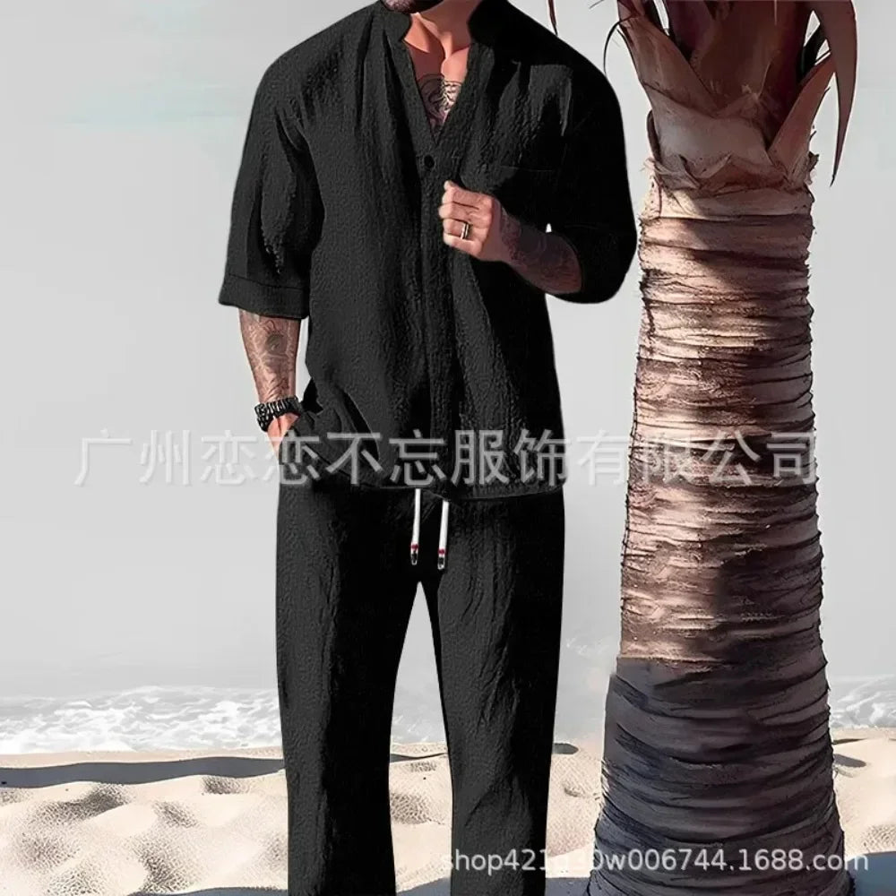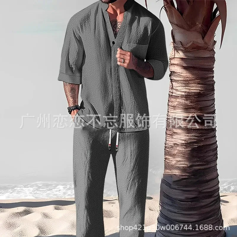 Summer Casual Cotton Linen Two Piece Men Set Fashion Loose V Neck Half Sleeve Tops and Trouser Suits Mens