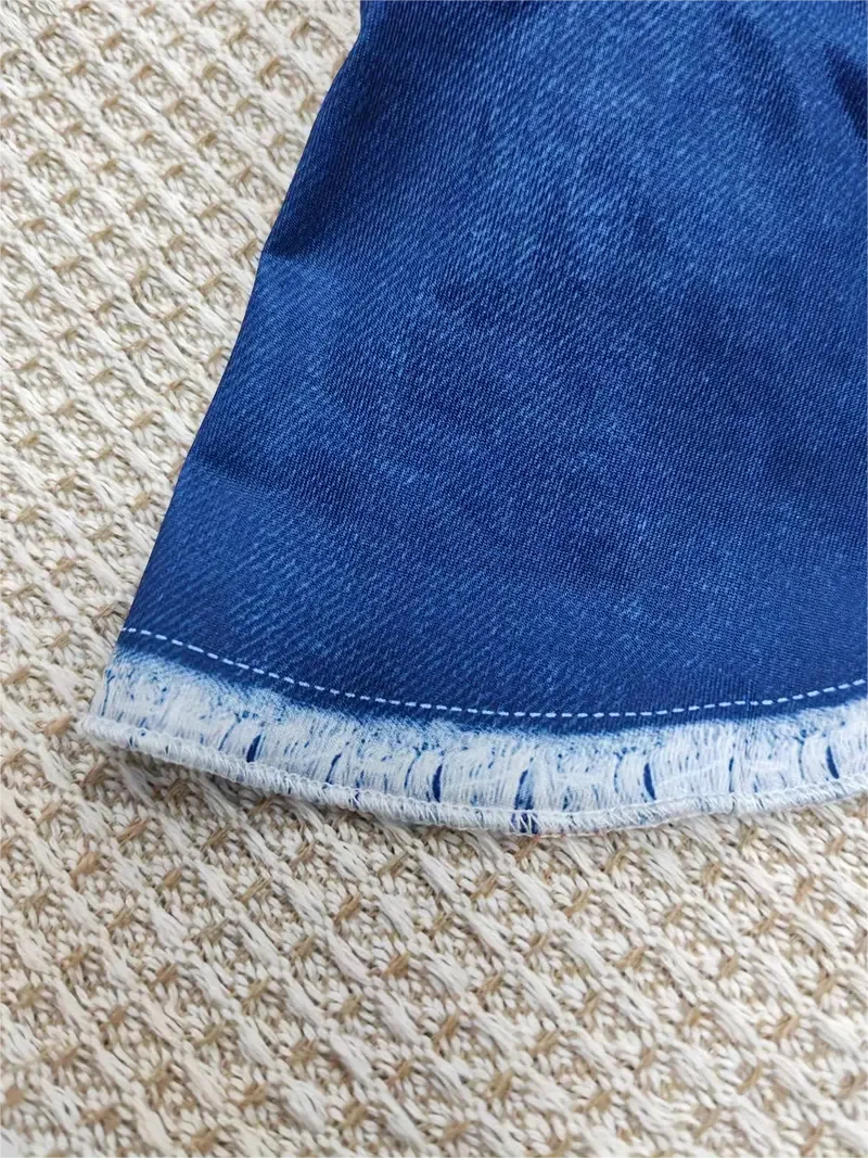Summer girls fashion trend set, 2-piece peplum cartoon unicorn T-shirt and faux denim print bell bottoms