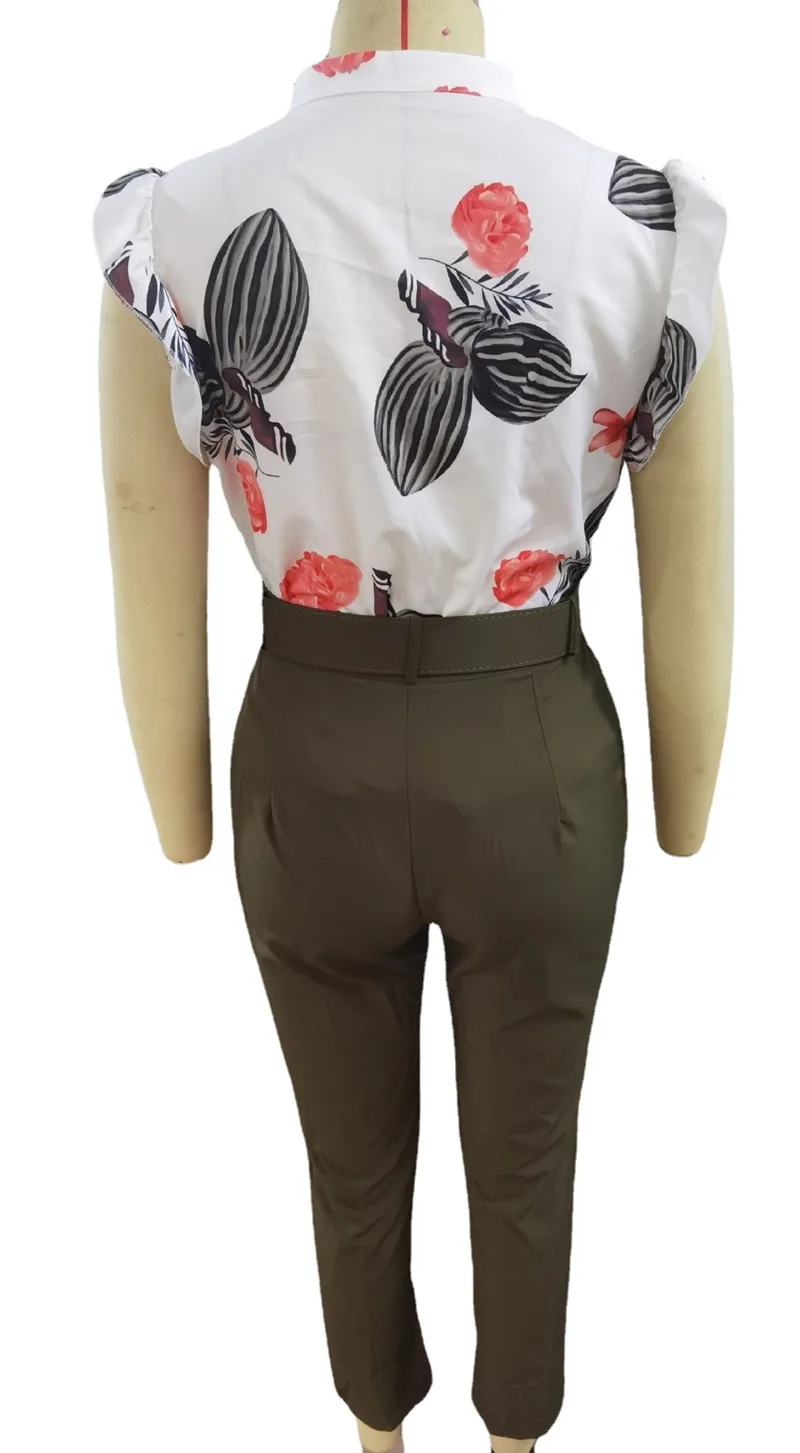 Summer Women's Flower Print Lotus Leaf Sleeve High Waist Pants Set Waist Belt Women's V-Neck Two Piece Set Work Suit Set