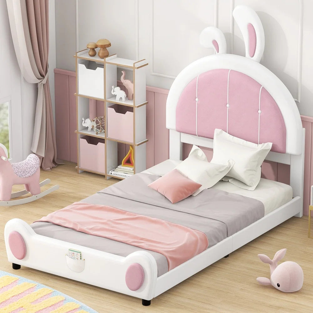 Upholstered Twin Platform Bed with Bunny Headboard Low Profile Kids Bed Easy Assembly Solid Wood Fun Design