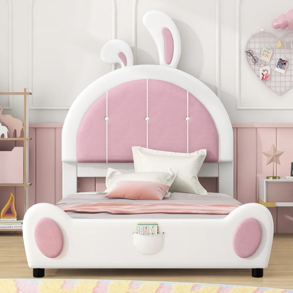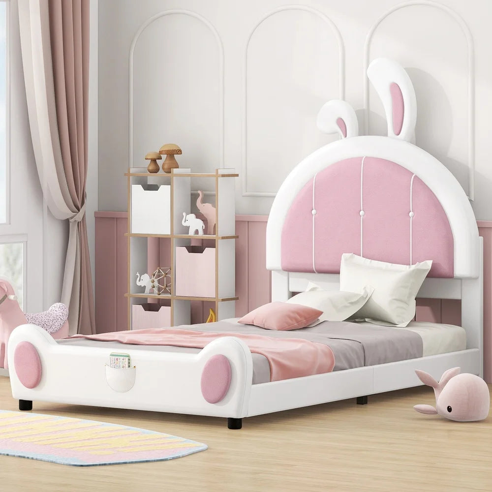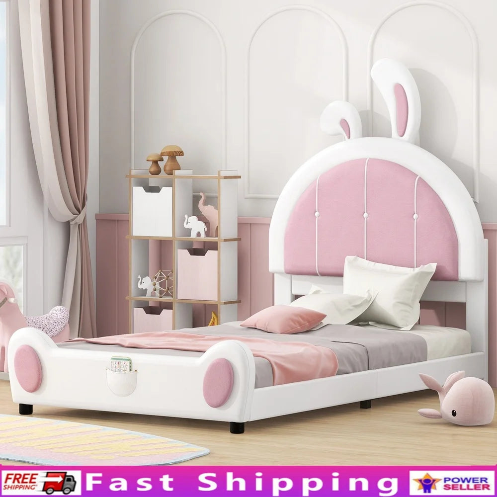 [Special Bed Frame]: This upholstery platform is made of solid wood and high quality upholstery. The bunny headboard will provide a soft lean on it, making the bed be good for reading or writing. All bed frame is upholstered with PU leather. Little pocket in footboard will also add fun to kids.