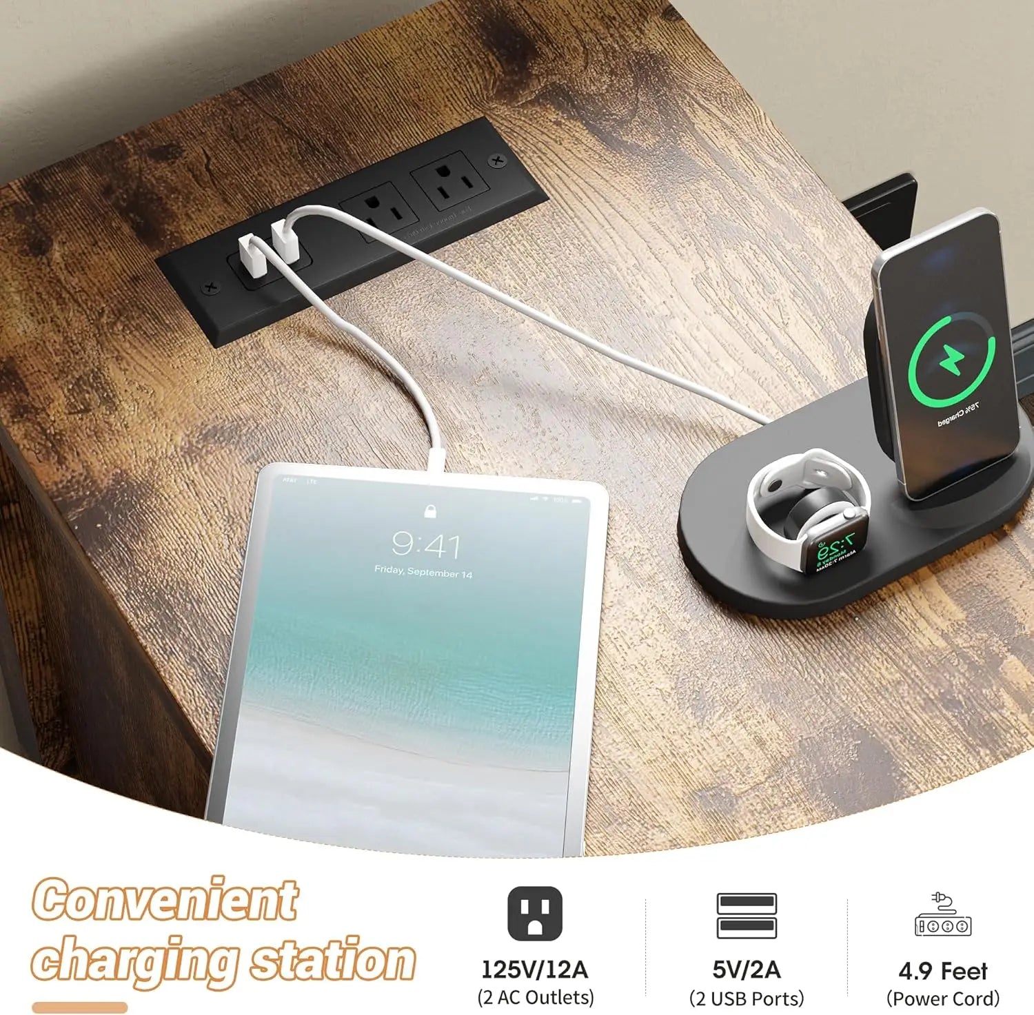 Vabches Nightstand with Drawer&Storage Cabinet Farmhouse Night Stand with Power Outlet Wood End Table Bedside Table for Bedroom