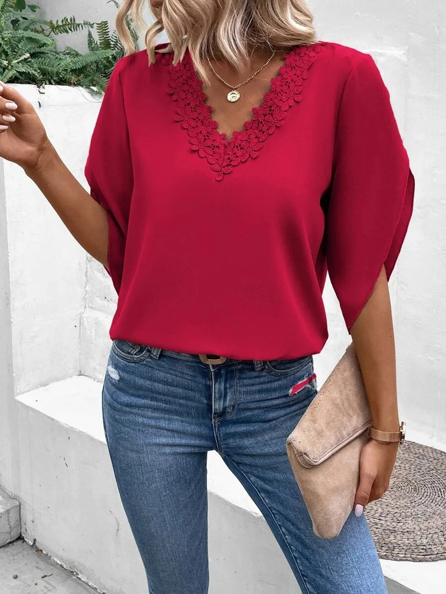 Women's Summer New Solid Lace V-neck Flare Sleeve Loose Fitting Shirt Elegant Fashion Casual Chiffon Versatile Pullover Shirt