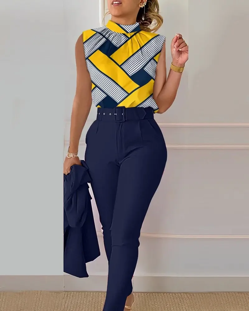 Women's Two Piece Set O Neck Sleeveless Top Pencil Pants Fashion Print With Belt Blouses Tank 2 Piece Set Female Women Clothing